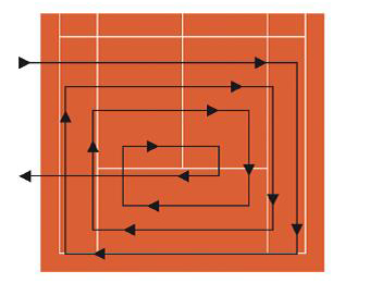 Na het spelen dienen de padel- en tennisbanen geveegd te worden. Dit doe je door een steeds kleiner rondje te lopen met het sleepnet (beginnend bij het net, zie afbeelding).