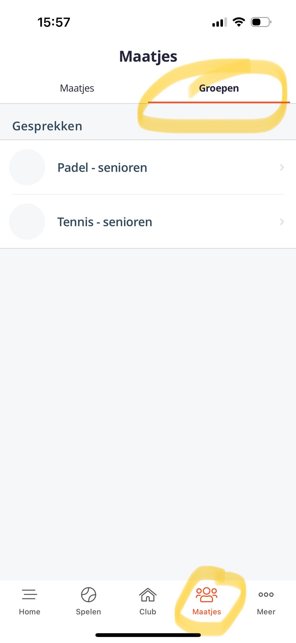 In de KNLTB Club App hebben wij 2 groepschats aangemaakt voor alle leden. 1 voor tennis en 1 voor padel. Laat in de chat een berichtje achter als je maatjes zoekt om mee te padellen of tennissen. Wel handig om je notificaties aan te zetten van de app zodat je een melding krijgt bij een berichtje.